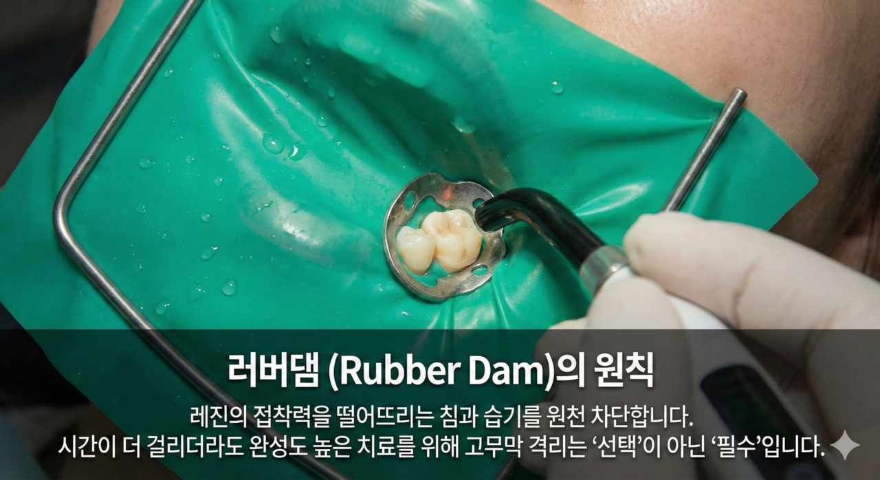 2. 러버댐 (Rubber Dam)의 원칙 레진의 접착력을 떨어뜨리는 침과 습기를 원천 차단합니다. 시간이 더 걸리더라도 완성도 높은 치료를 위해 고무막 격리는 '선택'이 아닌 '필수'입니다.