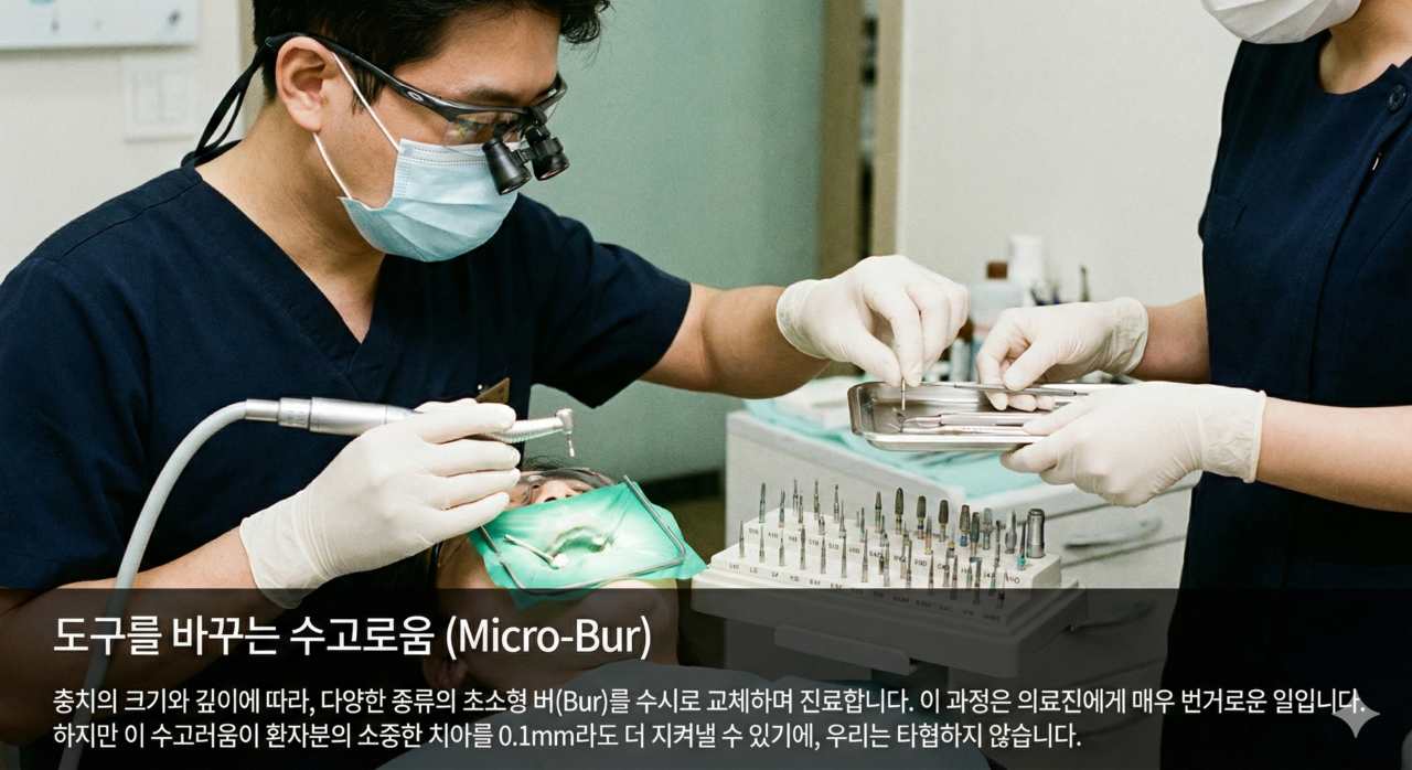 1. 도구를 바꾸는 수고로움 (Micro-Bur) 충치의 크기와 깊이에 따라, 다양한 종류의 **초소형 버(Bur)**를 수시로 교체하며 진료합니다.