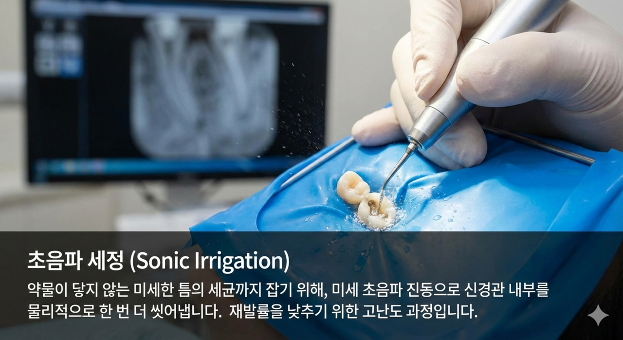 초음파 세정 (Sonic Irrigation) 약물이 닿지 않는 미세한 틈의 세균까지 잡기 위해, 미세 초음파 진동으로 신경관 내부를 물리적으로 한 번 더 씻어냅니다. 재발률을 낮추기 위한 고난도 과정입니다.